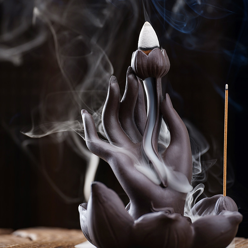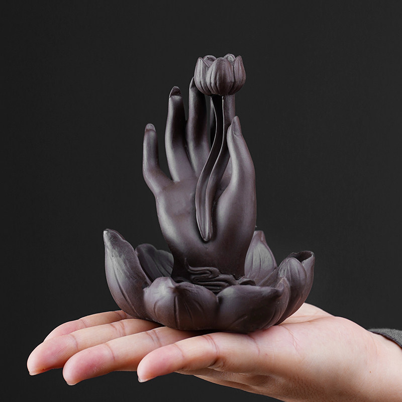 The magic of this Backflow Incense Burner Buddha Hand lies in its ethereal performance. When a special backflow cone is lit atop the lotus bud, the smoke does not rise into the air like ordinary incense. Instead, it becomes heavier than air, flowing downwards through the hollow stem of the lotus. It cascades gently over the smooth curves of the clay fingers, pooling in the lotus leaf base below. Watching the smoke dance and settle on this Backflow Incense Burner Buddha Hand creates a hypnotic, water-like effect that instantly lowers stress levels and quiets the mind.