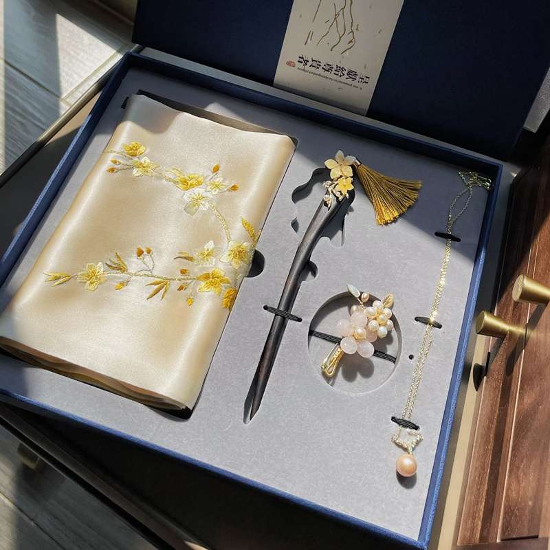 • Includes: 1x Silk Scarf, 1x Ebony Hairpin, 1x Pearl Necklace, 1x Enamel Brooch, all presented in a luxurious Handmade Suzhou Embroidery Silk Gift Box.