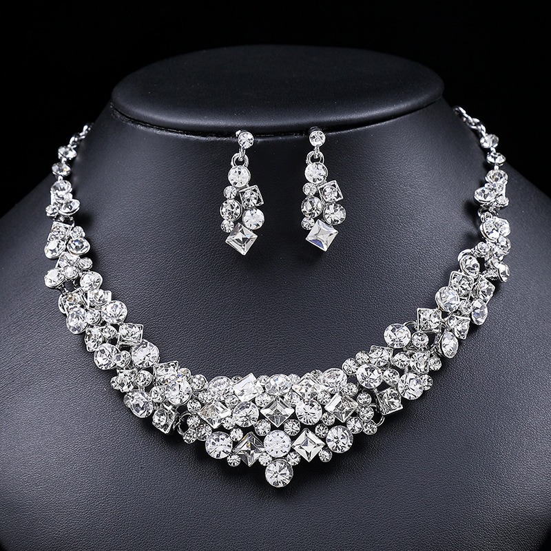 The design of this Luxury Crystal Glass Party Jewelry Set is a masterclass in geometric artistry. Unlike traditional floral sets, this piece features a sophisticated arrangement of square “princess-cut” and round-cut crystals. This mixture of shapes creates a multi-layered refraction of light, ensuring the set sparkles from every conceivable angle. The silver-tone alloy base provides a crisp, cool backdrop that enhances the clarity of the stones. This Luxury Crystal Glass Party Jewelry Set sits perfectly at the base of the neck, creating a broad collar of light that brightens the complexion and adds instant opulence to your evening silhouette.