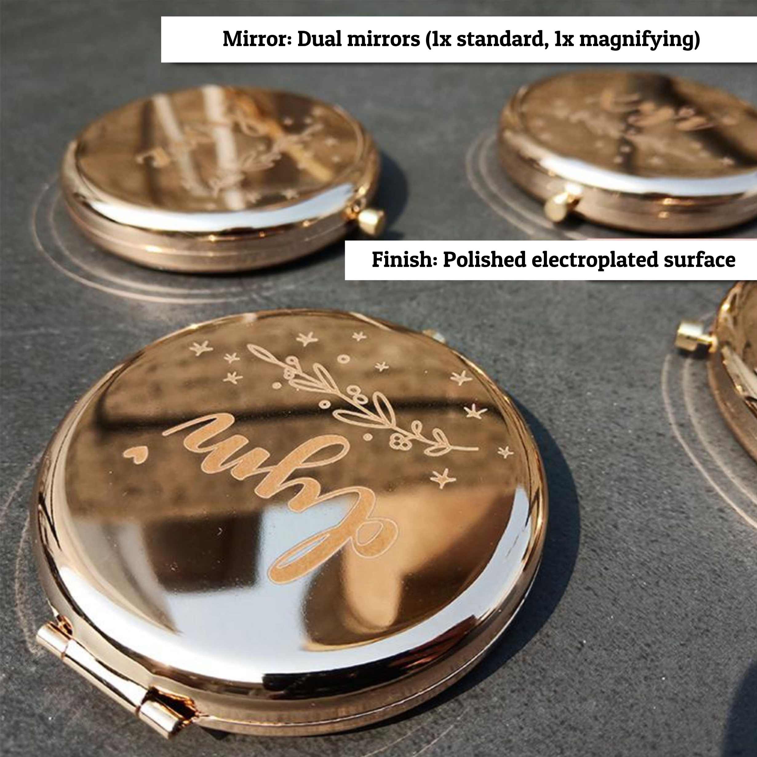 Reflect your unique style with our beautiful Personalized Compact Mirror. Featuring a delicate botanical design and a lustrous rose gold finish, this pocket-sized treasure can be custom engraved with a name or initials. This exquisite Personalized Compact Mirror is more than an accessory, it’s a cherished keepsake and the perfect, heartfelt gift for bridesmaids, birthdays, or any special occasion.