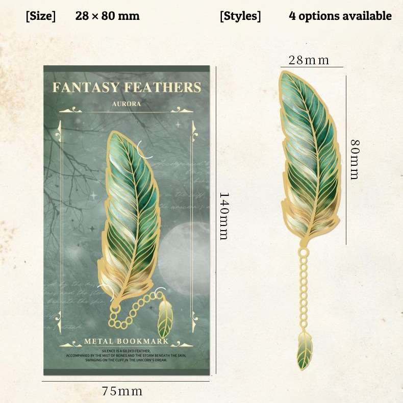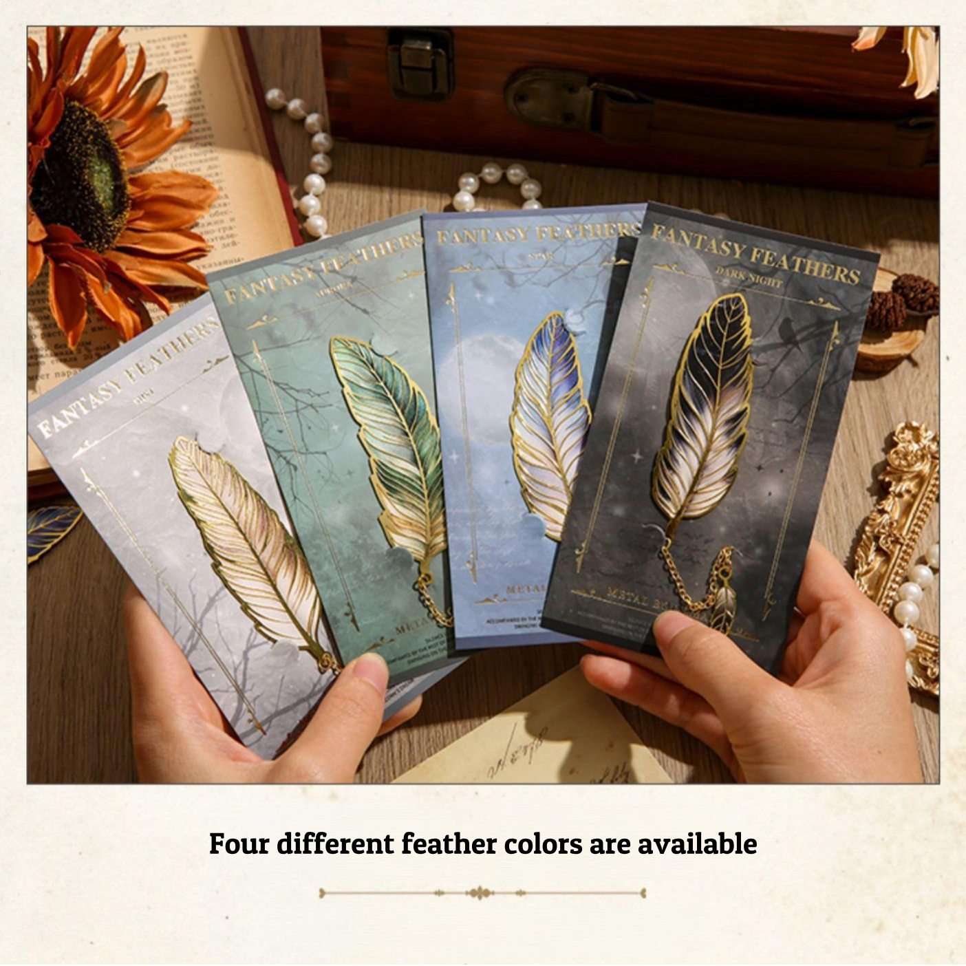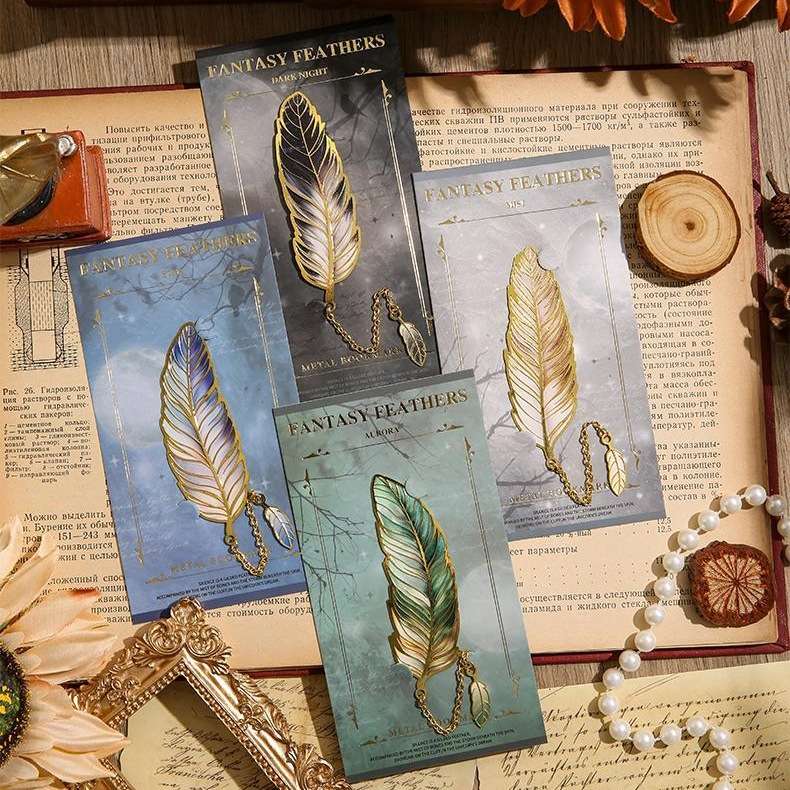 The design features an intricately detailed main feather with a polished gold-tone outline, filled with luminous, ethereal colors. A delicate chain dangles from its base, adorned with a smaller matching feather charm that gracefully hangs over the book’s spine. This vintage aesthetic makes each of these feather bookmarks a stunning accessory that adds a touch of fantasy and sophistication to your reading.