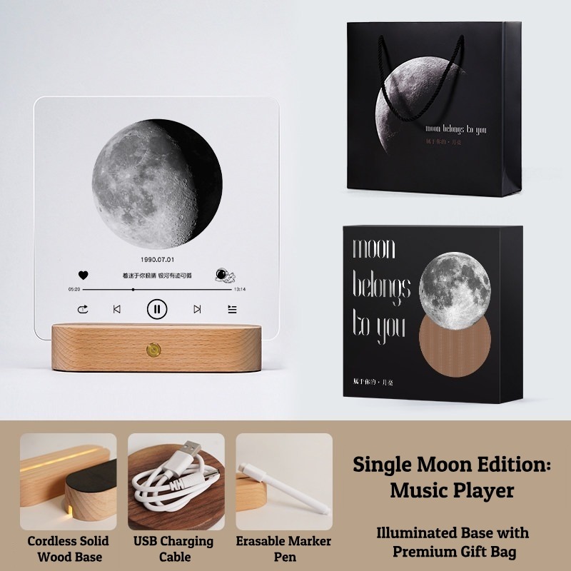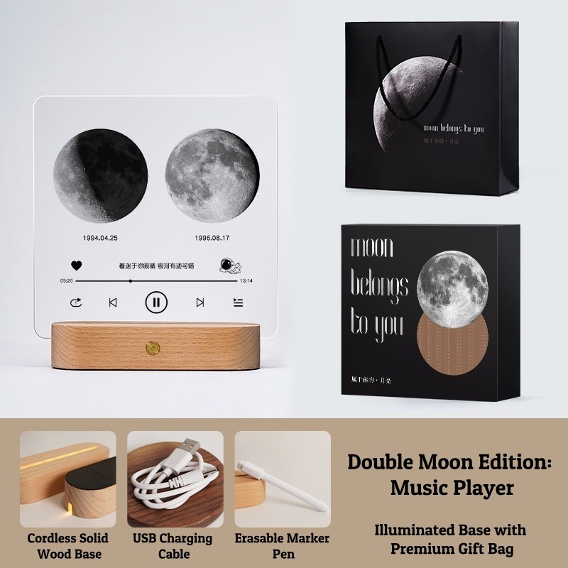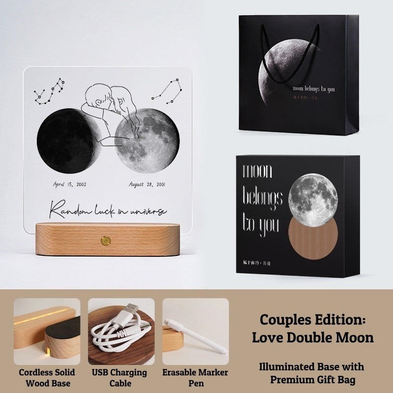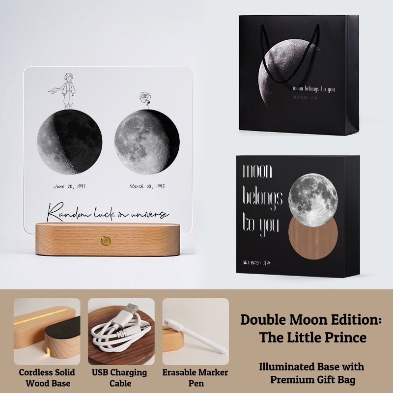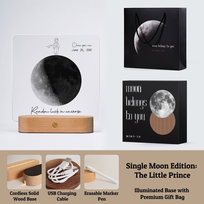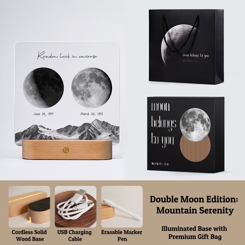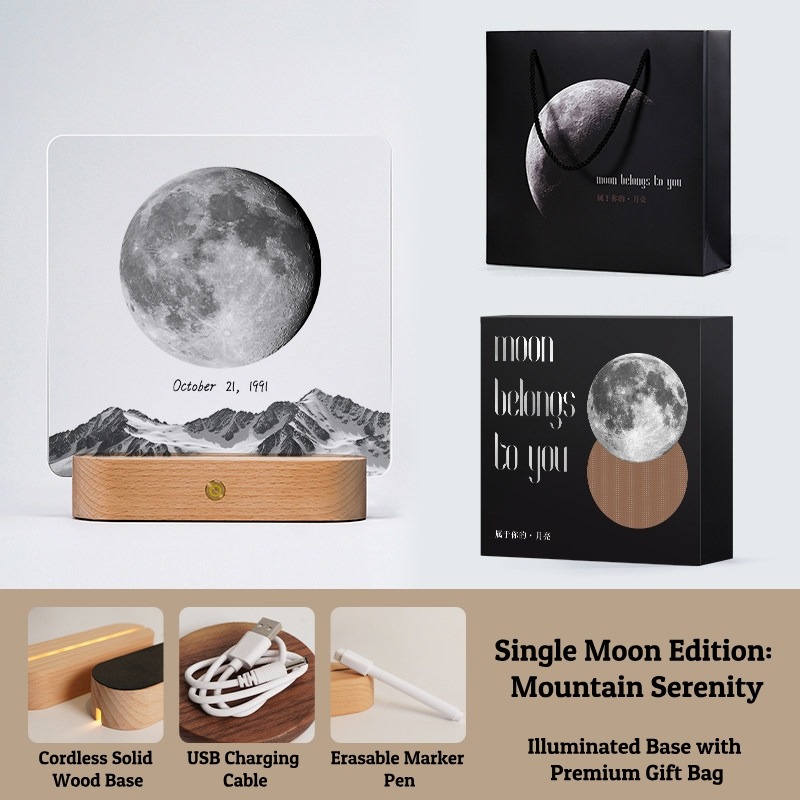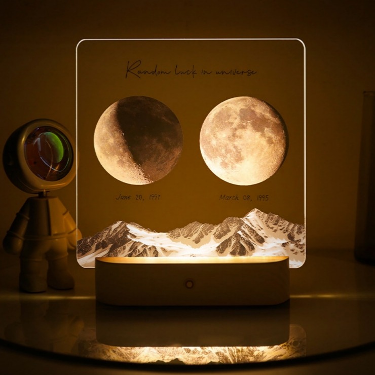 Capture the exact moon phase of your most special date with this Personalized Moon Phase Memorial Frame. Featuring a 5mm high-definition acrylic panel, a cordless rechargeable solid wood base, and multiple artistic styles (Mountains, Little Prince, Music Player), this lamp is a perfect keepsake. Customize it with a Name, Date, and Message to create a unique gift that glows with love.