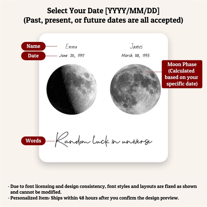 Because each Personalized Moon Phase Memorial Frame is uniquely crafted based on your specific Name, Date, and Quote, please understand that we cannot accept returns or exchanges for non-quality-related issues. We use professional-grade fonts and fixed layouts to ensure the highest aesthetic quality, so please double-check your provided information before finalizing your order. By choosing this Personalized Moon Phase Memorial Frame, you are investing in a handcrafted piece of the universe, made specifically for you and your loved ones.