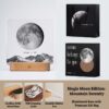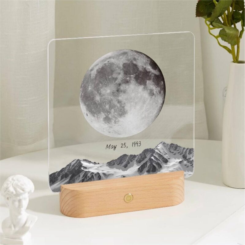 Every Personalized Moon Phase Memorial Frame is a bespoke creation. Using astronomical data, we calculate the precise phase of the moon based on the date you provide. From a delicate waxing crescent to a glowing full moon, the lunar image is high-definition and incredibly detailed, printed on a premium 5mm thick acrylic panel. This panel sits elegantly atop a handcrafted solid wood base, which features a warm LED light that brings the moon to life. This combination of natural materials and high-tech printing makes the Personalized Moon Phase Memorial Frame a sophisticated addition to any modern home decor.