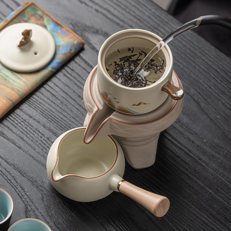 The standout feature of this Ru Kiln Automatic Gongfu Tea Set is its ingenious rotating discharge mechanism. Traditional Gongfu tea can sometimes lead to burnt fingers or over-steeped leaves, but this set solves both issues. By simply rotating the wooden handle of the fair cup (Gongdao cup) beneath the brewing vessel, the tea soup is released instantly through a built-in filter. This “1-second discharge” ensures that the tea leaves are perfectly separated from the water at the precise moment of optimal flavor. This Ru Kiln Automatic Gongfu Tea Set makes professional-grade brewing accessible to everyone, from beginners to seasoned tea masters.