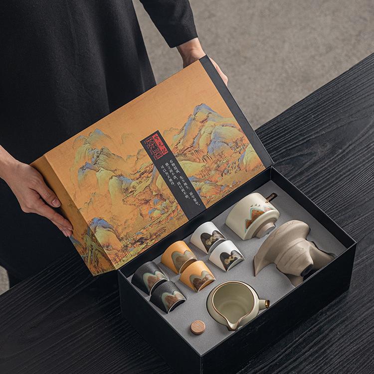 This Ru Kiln Automatic Gongfu Tea Set is a complete solution for hosting guests or enjoying a quiet moment of reflection. The set includes six delicate tasting cups (Pinming cups) in a variety of matching earth tones, a large fair cup with a heat-resistant wooden handle, and the central automatic brewing station. To complete the experience, we provide a high-quality tea towel for maintenance and a premium “Landscape” themed gift box with a matching carry bag. Whether it is a business gift or a centerpiece for your home, this Ru Kiln Automatic Gongfu Tea Set makes a profound statement of cultural sophistication.