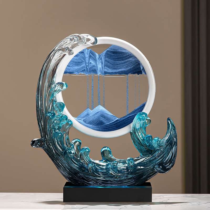 The magic of this kinetic artwork lies in the delicate dance of its components. Finely ground, shimmering sands in contrasting colors are suspended in a buoyant, crystal-clear liquid. Trapped within is a carefully measured layer of air. When you rotate the frame, the air acts as a regulator, forming a barrier of tiny bubbles that allows the sand to descend slowly and gracefully. It is this interaction that creates the breathtaking, intricate landscapes of majestic mountains, deep oceans, and gentle valleys that evolve before your very eyes. The wave-form frame, crafted from crystal-clear, hand-polished resin, captures this entire process in a dynamic embrace, symbolizing power and eternal motion.