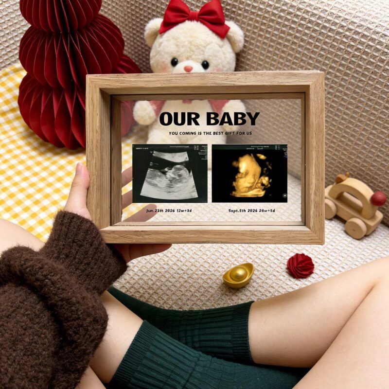 The Story of Growth: You can feature a standard 2D early-term scan next to a later 3D/4D scan, complete with custom text such as “My Baby: You coming is the best gift for us,” along with specific dates and gestational weeks (e.g., 12w+5d vs. 24w+5d).